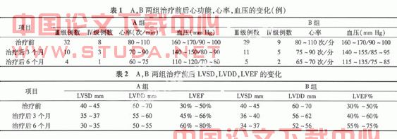 78例患者除4例(A组2例,B组2例)因严重乏力或头晕未达到设计最大剂量外,余74例均达最大剂量。A组40例患者前心功能Ⅲ级32例,Ⅳ级8例,治疗后3个月Ⅲ级10例,Ⅳ级3例,治疗后6个月,Ⅲ级4例,Ⅳ级1例;B组38例患者,治疗前心功能Ⅲ级29例,Ⅳ级9例,治疗后3个月,Ⅲ级12例,Ⅳ级5例,治疗后6个月,Ⅲ级5例,Ⅳ级2例。与治疗前相比,两组心功能均有明显改善,两组之间无明显差别。与治疗前相比,两组在治疗后3个月和6个月,LVSD、LVDD明显缩小,LVEF明显增加,心率、血压明显下降,而A组较B组更为明显,分别见表1及表2。?