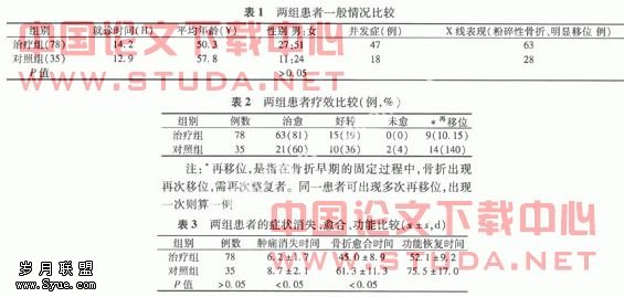 1.1 资料 将2006年至今我科门诊治疗的有完整随访资料的科雷氏骨折78例列为治疗组,将2002-2005年底按传统方法治疗的有完整随访资料的科雷氏骨折35例列为对照组。?