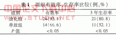 2.1 临床疗效 放疗结束后随防24~36个月,失访2例,随访率为95.6%。两组患者肿瘤消退情况,同步放化疗组:CR 15例、PR 9例、SD 2例,有效率为92.3%,3年生存率为80.8%(21例)。单纯放疗组:CR 7例、PR 7例、SD 5例、PD 2例,有效率为66.6%,3年生存率为52.1%(11例),两组差异有统计学意义(P<0.05),见表1 。?