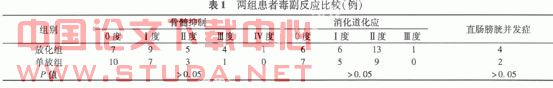 2.2 毒副作用 同步放化疗组毒副反应主要为骨髓抑制和消化道反应,出现骨髓抑制Ⅳ度1例、Ⅲ度4例、Ⅱ度5例、Ⅰ度9例、0度7例,经皮下注射泉升150 μg,未影响治疗。单纯放疗组骨髓抑制Ⅳ度0例、Ⅲ1例、Ⅱ度3例、Ⅰ度7例、0度10例。同步放化疗组Ⅲ度消化道反应1例、Ⅱ13例、Ⅰ度6例、0度6例;单放组:Ⅲ度0例、Ⅱ度9例、Ⅰ度5例、0度7例,经对症治疗好转。两组放射性直肠炎:同步放化疗组2例,单纯放疗组1例,放射性膀胱炎:同步放化疗组2例、单纯放疗组1例,两组比较无统计学差异,见表2。所有病例均未发生过敏反应及肝,肾功能损害,心脏毒性。 ?