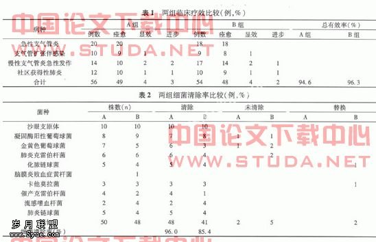 1.1 病例来源 将2006年4月至2007年12月确诊为下呼吸道细菌感染的住院患者分为两组,A组56例,用阿奇霉素序贯治疗;B组54例,用左氧氟沙星序贯治疗。A、B组的病种分别为急性支气管炎20、18例,支气管扩张伴感染10、9例,慢性支气管炎急性发作14(合并肺气肿4例)、17例(合并肺气肿3例),社区获得性肺炎12、10例,入院前48 h未用过它种抗菌药或用后无效(细菌培养仍阳性),少数患者分别合并轻度心、肝病症,无妊娠、哺乳、过敏体质等特殊病例。?