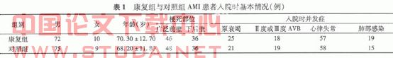 1.1 一般资料 2005年1月至2007年12月在汕头市中心心血管内科CCU住院并接受直接PCI治疗符合本研究标准的AMI患者166例。AMI诊断均符合国际心脏病学会和协会(ISFC) /世界卫生组织(WHO)诊断标准[1],并随机分为康复组82例,对照组84例,两组基本情况无统计学差异(P>0.05;见表1)。?