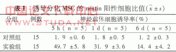 1.7 流式细胞仪对神经前体细胞检测 在MSC被诱导5 h,、1 d及6 d的3个时间点上分别进行流式细胞术检测,各时间点样本均为5例。FCM检测或制片后荧光显微镜下观察。?