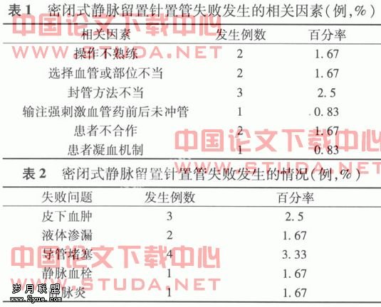 密闭式静脉留置针的临床应用表明,它不但能满足不同年龄及病种患者的长期输液,以及多次化疗外用各部位浅静脉严重破坏、穿刺极度困难患者的多次输液,而且也可以通过留置针留取动静脉血标本;置管操作简便,不良反应小,可明显减少多次静穿刺给患者造成的痛苦,既能保证静脉用药,又能提高护理人员的工作效率[1]。 按照美国B-D公司产品说明书的建议:留置时间为3~5 d,最好不超过1周[2]。据此,笔者认为,留置时间未达到1 d的应视为置管失败。由于密闭式留置针价格相对较贵,因其有外套管,穿刺针眼也比普通钢针大,为节约不必要的开支,减少患者的痛苦,有必要就置管失败的问题加以分析,并采取有效预防措施,进一步提高其使用效率。?