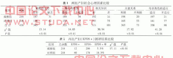 2.1 本组中随机各抽取观察组218例,对照组218例,对产妇采用不同的护理模式进行护理,然后采用社会心理因素问卷调查表进行调查,调查结果见表1。?