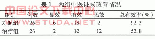 两组中医证候改善率(见表1):两组后,治疗组显效、有效、无效例数分别为6、18、2例,总有效率为92.3%;对照组依次为2、12、12例,总有效率为53.8%。两组经统计学处理,总有效率差异有统计学意义(P<0.05),说明对中医证候的改善,治疗组优于对照组。?