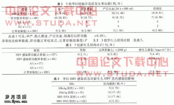 1.1 一般资料 将本市第一人民产科2003年1月1日至2006年2月30日405例住院分娩孕妇分3组:无症状HBV感染组157例;肝功能异常组48例,其中:转氨酶升高5倍以下为A1组,转氨酶升高5倍以上为A2组;正常妊娠组200例作为对照。3组孕前均无其他原发性疾病,无症状HBV感染组平均24.1岁,肝功能异常组平均24.5岁,对照组平均24.4岁。?