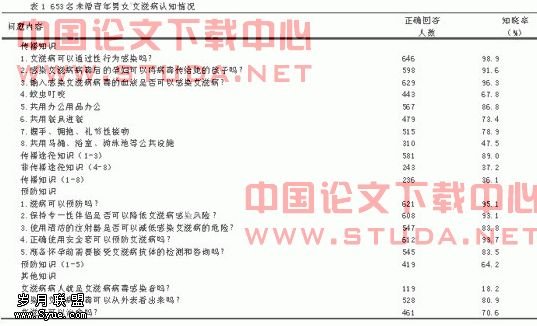 1.2 调查内容调查内容包括艾滋病的基本知识, 艾滋病的危害性、传播途径、对感染者态度以及预防意识等认识水平。