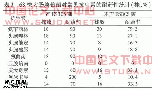 2.2 耐药性统计 由于泌尿系统感染的病源菌种类较多,本研究选择性统计了有代表意义的大肠埃希菌和凝固酶阴性葡萄球菌作为耐药性分析,68株大肠埃希菌中共检出20株产超广谱β-内酰胺酶(ESBLs)菌,耐甲氨西林凝固酶阴性的葡萄球菌(MRCNS)12株,甲氨西林敏感的凝固酶阴性的葡萄球菌(MSCNS)21株,药敏统计分析见表2、表3。?