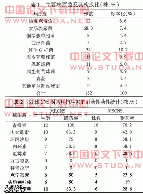 2.1 细菌的种类及构成比 共分离出182株细菌,革兰阴性杆菌127株,革兰阳性球菌46株,其中凝固酶阴性的葡萄球菌(CWS)33株,真菌有9株,主要菌种分布见表1。?