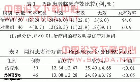 1.1 一般资料 本组病例共96例,全部选自河南中医学院第一附属康复中心病房,随机分为治疗组和对照组。治疗组50例中,男30例,女20例;年龄最小40岁,最大70岁;病程最短1个月,最长12个月。对照组46例,男28例,女18例;年龄最小40岁,最大70岁;病程最短1个月,最长12个月。两组患者一般资料经统计学分析,差异无统计学意义(P>0 05),有可比性。?