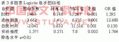 逐步回归法将表中显示的相关因子:性别、豆制品予以剔除,遗传因素、日照时间、体重以及劳动强度是骨关节炎的独立危险因素。