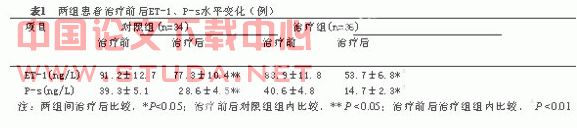 治疗前两组间各指标水平的差异无统计学意义 (P>0.05);治疗2周后,两组内治疗前后比较ET-1、P-s显著下降,差异有统计学意义 (治疗组P<0.01,对照组P<0.05);治疗2周后,两组间比较ET-1、P-s差异有统计学意义(P<0.05)。见表1。