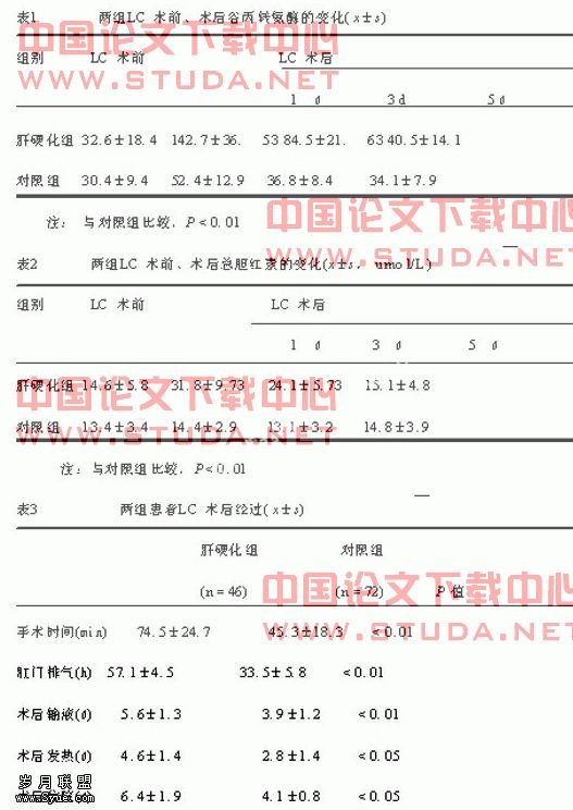全组均无死亡。合并肝硬化组无肝昏迷和上消化道出血, 术后出现腹水2 例, 穿刺孔渗血9 例; 术后1 d和 3 d转氨酶和胆红素比对照组明显增高(P < 0.01) , 5d恢复正常, 两组比较详见表1、表2; 两组患者术后经过见表3, 合并肝硬化组手术时间、术后肛门排气时间、输液天数、发热天数和术后住院天数均较对照组明显延长。