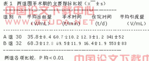 由表1可见,A组的平均出血量和平均引流量明显少于B组,A组的手术时间及住院时间也明显短于B组,差异均有显著性(P<0.01)。
