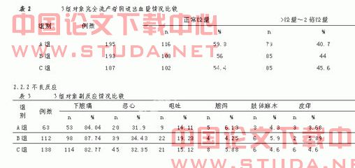 3组完全流产者,孕囊排出后阴道出血持续天数分别为A组(9.2±2.8)d,B组(9.5±2.9)d,C(12.8±3.2)d,C组与A、B组比较差异有统计学意义(P<0.01),A、B两组间差异无统计学意义(P>0.05)。阴道出血量见表2。