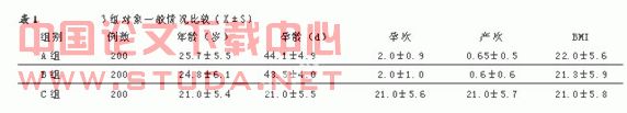 2.1一般情况3组对象年龄、身高、体重指数(BMI)、孕次、产次、孕龄等差异均无统计学意义(P>0.05),见表1。