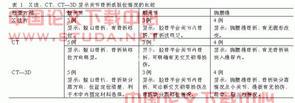12例骨关节损伤病人的X线片、CT、CT—3D显示关节骨折或脱位情况如表1。12例手术病人手术中所见骨折,骨片移位情况与CT—3D相符。