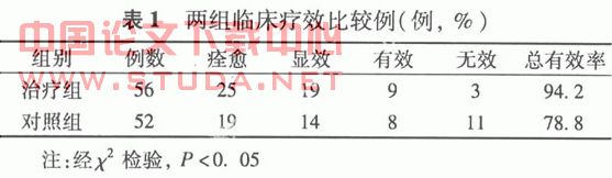 2.2 治疗结果 疗效比较经1个疗程治疗后,两组疗效比较,见表1。?