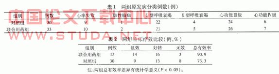 1.1 研究对象 选用2005年1月至2008年1月本院收治的72例慢性肺源性心脏病患者63例。均符合1997年全国肺心病第二次专业会议诊断标准。随机分为对照组30例,联合用药组33例。联合用药组男19例,女14例,年龄61~82岁, 平均(67±8)岁,平均病程14年。对照组男18例,女12例,年龄61~85岁, 平均(66±7)岁,平均病程15年。入院后均检查电解质、血气分析、血液黏度和心电图。两组病例年龄、性别、病程、心功能、原发病比较无统计学意义,具有可比性。见表1。?