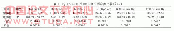 1.1 对象 73例均为2002年10月至2007年10月在本院体检的健康育龄妇女,其中38例围绝经期妇女作为观察组,年龄40~55岁,平均48岁,另35例为同期在本院体检的育龄妇女为对照组,年龄25~39岁,平均32岁。73例均无内分泌疾病,无服用降压药和性激素史。?