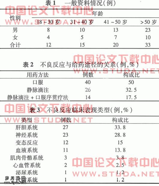 通过文献检索,收集2003年1月至2008年1月国内发表有关莫西沙星不良反应的期刊14种[2-10],文献46篇,共计80例。?