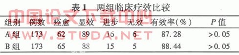由表1可见,A、B组的临床有效率分别为87.28%、88.44%,二者比较差异无统计学意义(P>0.05)。?