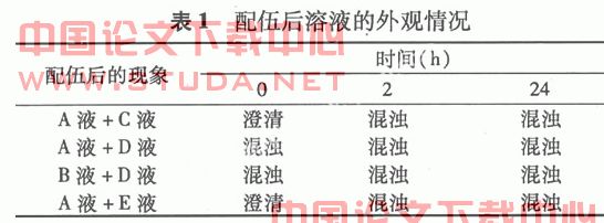 2.2.2 试管实验 取A液与C液各5 ml,A液与D液各5 ml,B液与D液各5 ml,A液与E液各5 ml分别混合,于0、2、24 h观察溶液外观变化。结果见表1。?