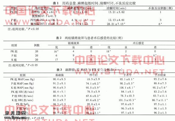 1.2 麻醉方法 患者术前30 min肌内注射阿托品0.5 mg、苯巴比妥钠0.1 g,入手术室后开放上肢静脉通路,给予面罩充分吸氧,铺消毒铺巾后,开始麻醉。PK组缓慢静脉注射丙泊酚-氯胺酮合剂(按丙泊酚剂量给1.0 mg /kg)诱导,术中持续静脉泵入丙泊酚-氯胺酮合剂;P组缓慢静脉注射丙泊酚1.5~2 mg/kg诱导,术中持续静脉泵入丙泊酚维持麻醉;K组缓慢静脉注射氯胺酮1.5 mg/kg诱导,术中持续静脉泵入氯胺酮维持麻醉。各组根据患者的麻醉效果,决定持续静脉泵入麻醉用药维持量,并与术毕前5 min停用麻醉药。?