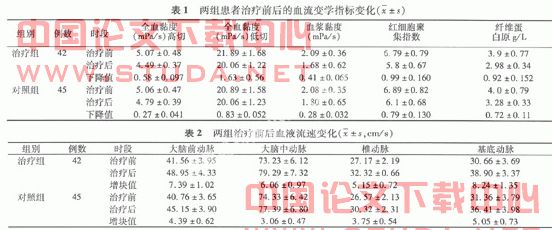 1.3 观察指标 治疗前及治疗后2周分别检测血流变学指标变化,并行经颅多普勒(TCD)检查,测定大脑动脉血流速度。?
