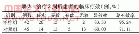 1.4 疗效评定 临床痊愈:临床症状全部消失;显效:症状体征减少≥50%;有效:症状体征减少<50%;无效:治疗后病情无变化或恶化。?