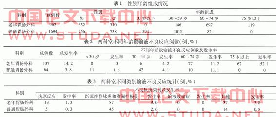 结果表明,老年胃肠外科总的和普通胃肠外科输液不良反应总发生率显著高于普通胃肠外科,且不良反应发生率随年龄的增大显著升高,特别是75岁以上患者输液不良反应发生率达50%以上。?