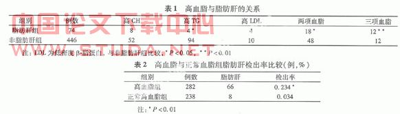结果分析表明,高血脂组脂肪肝的检出率高于正常血脂组,在表2中可看出高血脂282例合并脂肪肝66例,其发生率为23.4%,正常血脂组238例合并脂肪肝8例,其发生率为3.36%,高血脂合并脂肪肝明显高于正常血脂组。?