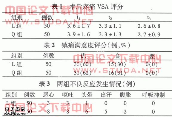 两组患者年龄、体质量、手术时间及方式无统计学意义。VSA评分和镇痛满意度见表1和表2,两组比较差异无统计学意义(P>0.05)。两组不良反应的发生率差异有统计学意义(P<0.05),L组副反应低于Q组见表3。