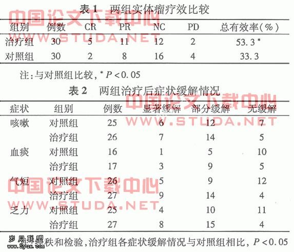1.1 一般资料 选择本院2005年3月至2008年3月确诊为中晚期肺癌60例住院患者,随机分为对照组30例和治疗组30例。对照组男21例,女9例;年龄41~72岁,平均61.2岁;鳞癌17例,腺癌10例,小细胞未分化癌3例。治疗组男23例,女7例;年龄46~77岁,平均62.5岁;鳞癌16例,腺癌9例,小细胞未分化癌5例。两组一般资料经统计学处理,差异均无统计学意义(P<0.05),具有可比性。?