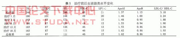 2.2 血脂变化 治疗前后血清脂类水平变化如表1 所示。?