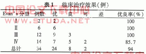 1.1 一般资料 本组34例,男22例,女12例,年龄30~82岁,平均56 岁,高能量损伤8例,低能量损伤26例,按 Evan’ s分型,见表1。