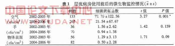 1.1 一般资料 本院严格按照《感染管理规范(试行)》[2]每月对新生儿病房进行环境卫生学监测。本文回顾分析本院新生儿科空气净化层流病房投入使用前(2002-2003年)、后(2004-2006年)的微生物监控情况,主要包括病房空气、物体表面、医护人员手的细菌培养菌落数量的对比分析。