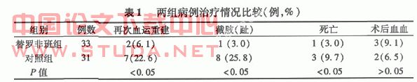 1.3 统计学方法 采用SPSS 11.5统计学分析软件,对两组患者术后再次血运重建、截肢(趾)、病死和术后出血等观察指标以百分构成比表示,行χ2检验,P<0.05差异有统计学意义。