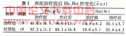 治疗组和对照组分别进行治疗前后Hb、HCT比较,P值均<0.01,差异均有统计学意义,治疗12周后两组间Hb、H ct比较,P值均<0.01,差异具有统计学意义,治疗组Hb和HCT纠正水平明显高于对照组。