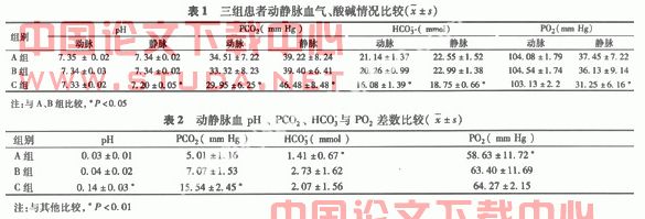 中心静脉血气不仅能反映组织酸碱状态,且能反映组织氧合和耗氧状况。笔者资料中,动脉氧分压无论A组、B组、C组均显示正常,且三组无显著差异。这可能与患者入院后均予以吸入不同浓度氧气,而中心静脉受吸氧因素影响小,故在严重心力衰竭、循环衰竭患者,中心静脉所反映缺氧状况比动脉血要灵敏。