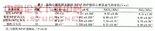 本临床研究结果初步表明,急性心源性肺水肿患者在常规治疗基础上应用BiPAP辅助通气收到了良好的治疗效果,心率、pH值、PaCO2、PaO2均显著改善,值得临床推广应用,严格把握适应证、调整适合个体的压力参数均是影响治疗成败的关键环节,需根据病情灵活掌握。