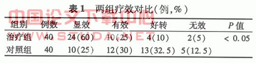 1.1 一般资料 全部80例患者均系2006年2月至2008年10月住院及门诊患者,完全随机分为两组,治疗组40例,其中男36例,女4例;年龄40~69岁,平均(57.85±2.43)岁;对照组40例,其中男34例,女6例;年龄41~67岁,平均(55.87±4.56)岁。两组性别、年龄经统计学处理,差异无统计学意义(P>0.05),组间均衡性良好,具有可比性。