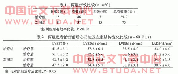 两组治疗前后均进行心脏彩超检查,心功能及左室结构指标(LVEF、LVEDd、LVESd、LADd) 均有明显改善(P<0.01),治疗组明显优于对照组(P<0.05) 。 3 讨论