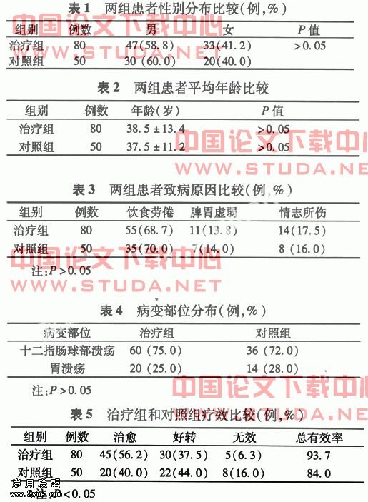 3.1 病例选择 共130例,均经内镜检查证实胃及十二指肠球部有活动性溃疡存在。随机分为治疗组80例和对照组50例。排除①有心、肝、肾等严重疾病及其功能严重障碍者;②合并有或其他合并症者;③溃疡已经癌变者;④未能按规定用药,无法判定疗效的患者。两组在年龄、性别、致病原因大致相同,经统计学处理差异无统计学意义(P>0.05)具可比性见表1-4。