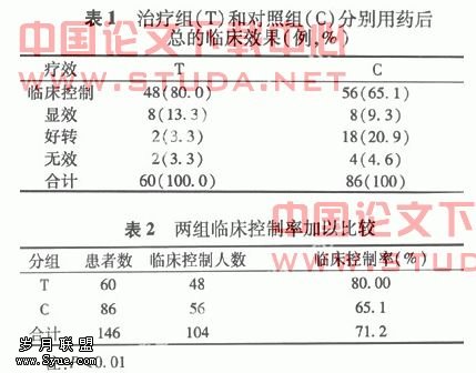 1.4 统计学方法 临床控制率、临床控制率与显效率总和的两组比较采用χ2检验。
