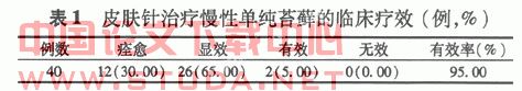 1.1 一般资料 选择2005年7月至2007年12月来本院皮肤科门诊诊治的慢性单纯苔藓患者40例,其中男21例,女19例;年龄15~65岁,平均34.75岁;病程5 d~2年(平均4.6个月);患病部位颈部16例,肘关节部位10例,腰骶部10例,手背4例,足背5例,背部2例;皮损面积最小0.5 cm×l cm,最大8.5 cm×10 cm,皮损数目最少1处,最多达6处。