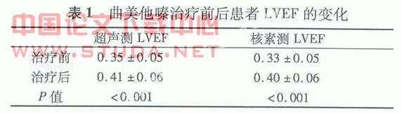 2.1 曲美他嗪治疗前后患者LVEF改变见表1。?