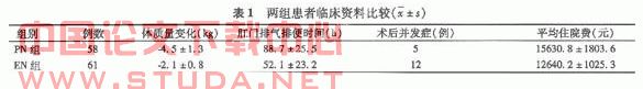 1.1 一般资料 119例胃癌切除患者,分为EN组和PN组。EN组61例:男40例,女21例,年龄41~66岁。近端胃癌切除38例,远端胃癌切除13例,全胃切除空肠代胃10例;PN58例:男38例,女20例,年龄43~65岁。近端胃癌切除33例,远端胃癌切除18例,全胃切除空肠代胃7例。?
