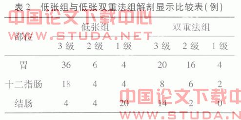 2.2 低张组和双重法组比较 低张组胃部十二指肠部显示结构病例数量最多,3级2级病例数72例,结肠结构显示欠佳;双重法组对结肠的微细结构显示最佳,结肠检查数里占了14例,胃、十二指肠就欠佳。这是跟检查者及患者的合作程度因素有关。